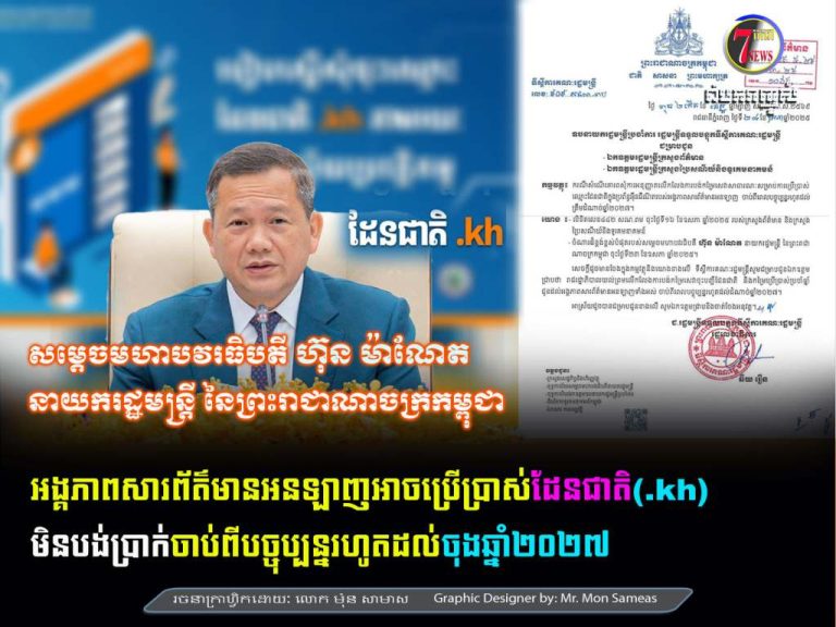 សម្តេចមហាបវរធិបតី ហ៊ុន ម៉ាណែត នាយករដ្ឋមន្ត្រី នៃព្រះរាជាណាចក្រកម្ពុជាអនុញ្ញាត ទីស្តីការគណៈរដ្ឋមន្ត្រី-លេខ៩០៩ សជណ.ពប-រាជធានីភ្នំពេញ.,ចុះថ្ងៃទី២៨ ខែ ឧសភា ឆ្នាំ ២០២៥- ប្រកាសលើកលែងការបង់កម្រៃសេវាសាធារណៈសម្រាប់ការប្រើប្រាស់ឈ្មោះដែនជាតិ(.kh)ក្នុងប្រព័ន្ធអ៊ីនធឺណិត(Internet)របស់អង្គភាពសារព័ត៌មានអនឡាញចាប់ពីពេលបច្ចុប្បន្នរហូតដល់ត្រឹមដំណាច់ឆ្នាំ២០២៧។
