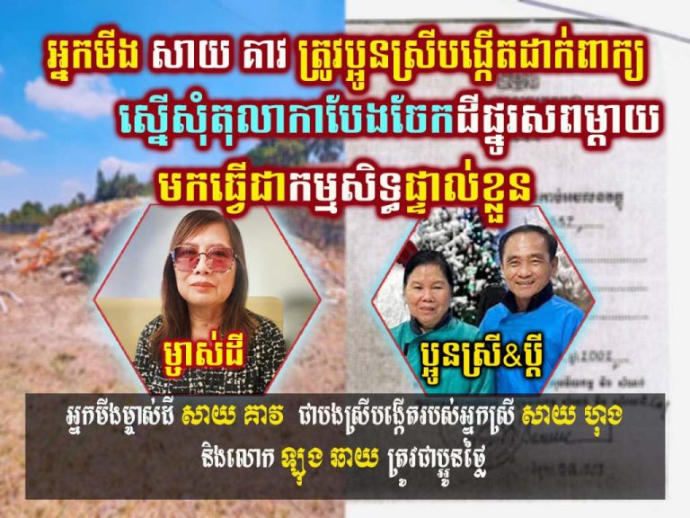 រាជធានីភ្នំពេញ៖ រឿងរ៉ាវដែលគួរឱ្យភ្ញាក់ផ្អើលមួយ បានកើតឡើងក្នុងគ្រួសារមួយដែលមានបងប្អូនស្រី៣ នាក់ ដែលបងស្រីទី១ រស់នៅសហរដ្ឋអាមេរិក បានផ្ញើប្រាក់មកអោយម្ដាយនិងប្អូនស្រីពៅ ទិញដីមួយកន្លែង ដើម្បីទុកជាទីបញ្ចុះសពម្ដាយ ពេលគាត់ចែកឋានទៅ តែពេលដែលម្ដាយទទួលមរណភាព ប្អូនស្រីពៅ បែជា ដាក់ពាក្យស្មើរសុំទៅតុលាការ អោយបែងចែកដីនេះ ជាបីចំណែកទៅវិញ ស្របពេលដែលផ្នូរសពម្ដាយបានបញ្ចុះ នៅក្នុងទីតាំងដីនោះ ដោយសំអាងថា ដីនោះជាកេរមរតករបស់ម្ដាយ។...