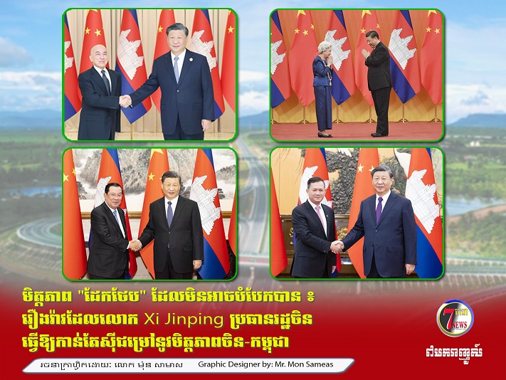 មិត្តភាព "ដែកថែប" ដែលមិនអាចបំបែកបាន ៖ រឿងរ៉ាវដែលលោក Xi Jinping ប្រធានរដ្ឋចិនធ្វើឱ្យកាន់តែស៊ីជម្រៅនូវមិត្តភាពចិន-កម្ពុជា ខែកុម្ភៈ ឆ្នាំ ២០២៣ លោក Xi Jinping ប្រធានរដ្ឋចិនបានជួបពិភាក្សាការងារជាមួយសម្តេច ហ៊ុន សែន នាយករដ្ឋមន្ត្រីកម្ពុជានៅទីក្រុងប៉េកាំង ។ នេះជាការសន្យារវាងមិត្តចាស់...