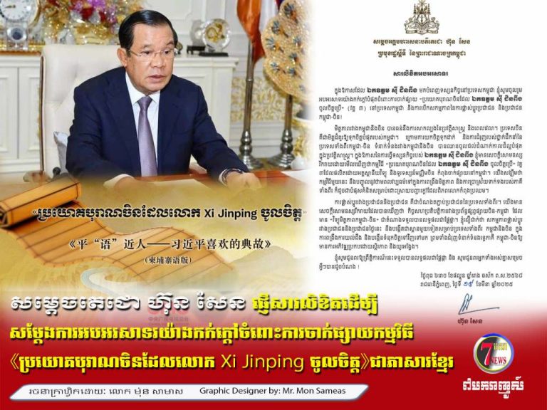ក្នុងឱកាសដែលឯកឧត្តម Xi Jinping ប្រធានរដ្ឋចិនអញ្ជើញបំពេញទស្សនកិច្ចផ្លូវរដ្ឋនៅប្រទេសកម្ពុជា នៅថ្ងៃទី១៧ខែមេសាតាមម៉ោងក្នុងតំបន់ ពិធីសម្ពោធការចាក់ផ្សាយកម្មវិធី《ប្រយោគបុរាណចិនដែលលោក Xi Jinping ចូលចិត្ត》(ភាសាខ្មែរ)ដែលផលិតដោយអគ្គស្ថានីយវិទ្យុនិងទូរទស្សន៍មជ្ឈិមចិនបានរៀបចំធ្វើនៅរាជធានីភ្នំពេញ ។ សម្តេចតេជោ ហ៊ុនសែន ប្រធានព្រឹទ្ធសភាកម្ពុជាបានផ្ញើសារលិខិត ដើម្បីសម្តែងការអបអរសាទរយ៉ាងកក់ក្តៅចំពោះការចាក់ផ្សាយកម្មវិធីនេះនៅកម្ពុជា ។ សម្តេចតេជោ ហ៊ុនសែន បានថ្លែងក្នុងសារលិខិតថា មិត្តភាពកម្ពុជា-ចិនបានធន់នឹងការសាកល្បងនៃប្រវត្តិសាស្ត្រនិងពេលវេលា ប្រទេសចិនគឺជាមិត្តដ៏គួរឱ្យទុកចិត្តបំផុតរបស់កម្ពុជា...