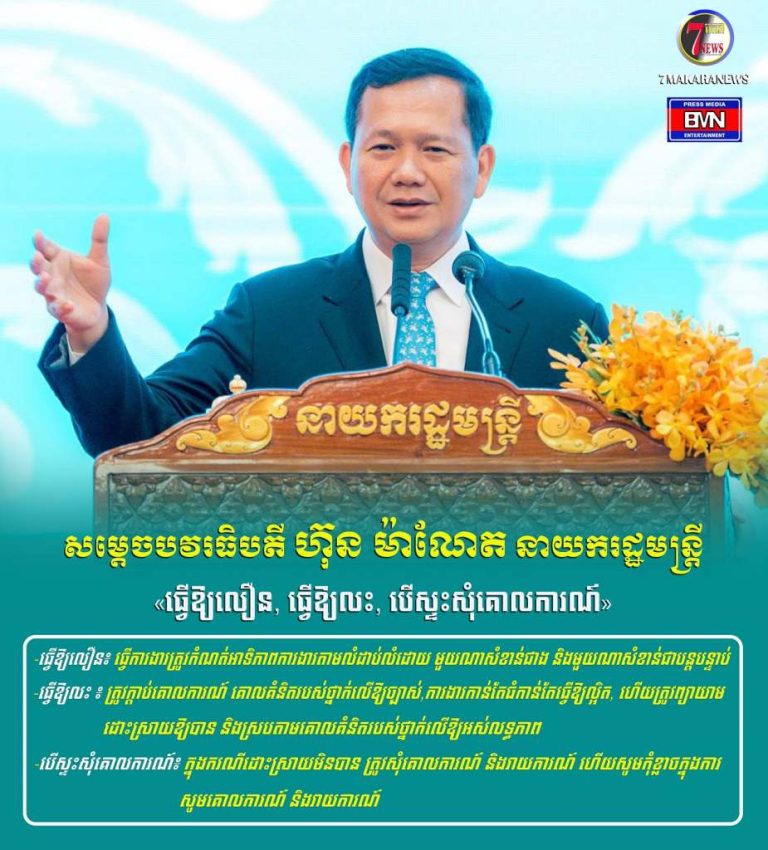 សម្ដេចបវរធិបតី ហ៊ុន ម៉ាណែត នាយករដ្ឋមន្ត្រី៖ ធ្វើឱ្យលឿន, ធ្វើឱ្យលះ, បើស្ទះសុំគោលការណ៍ -ធ្វើឱ្យលឿន៖ ធ្វើការងារត្រូវកំណត់អាទិភាពការងារតាមលំដាប់លំដោយមួយណាសំខាន់ជាង និងមួយណាសំខាន់ជាបន្តបន្ទាប់ -ធ្វើឱ្យលះ ៖ ត្រូវក្ដាប់គោលការណ៍ គោលគំនិតរបស់ថ្នាក់លើឱ្យច្បាស់, ការងារកាន់តែធំកាន់តែធ្វើឱ្យល្អិត, ហើយត្រូវព្យាយាមដោះស្រាយឱ្យបាន និងស្របតាមគោលគំនិតរបស់ថ្នាក់លើឱ្យអស់លទ្ធភាព -បើស្ទះសុំគោលការណ៍៖ ក្នុងករណីដោះស្រាយមិនបាន ត្រូវសុំគោលការណ៍...