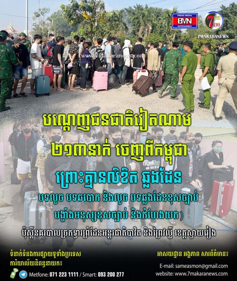 កម្ពុជាបណ្តេញជនជាតិវៀតណាម ២១៣នាក់ ចេញពីកម្ពុជា ពាក់ព័ន្ធករណីលួចស្នាក់នៅធ្វើការងារខុសច្បាប់ គ្មានលិខិត ឆ្លងដែន។ ខេត្តស្វាយរៀងឧត្តមសេនីយ៍ឯក សុខ វាសនា អគ្គនាយកអន្តោប្រវេសន៍ បានណែនាំឱ្យនាយកដ្ឋានស៊ើបអង្កេត និងអនុវត្តនីតិវិធី ធ្វើការបណ្តេញជនជាតិវៀតណាមសរុបចំនួន ២១៣នាក់ (ស្រី២៣នាក់) ចេញពីព្រះរាជាណាចក្រកម្ពុជានៅថ្ងៃទី ៥-៦ ខែកុម្ភៈ ឆ្នាំ២០២៥ តាមប៉ុស្តិ៍នគរបាលច្រកទ្វារព្រំដែនអន្តរជាតិបាវិត...