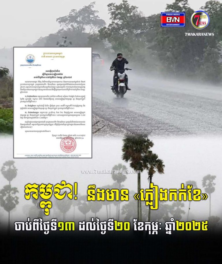ក្រសួងធនធានទឹក និងឧតុនិយម សូមជូនដំណឹងដល់សាធារណជន និងអាជ្ញាធរដែនដី មេត្តាយកចិត្តទុកដាក់ប្រុងប្រយ័ត្នខ្ពស់ ដើម្បីជៀសវាងពីគ្រោះថ្នាក់ផ្សេងៗដែលអាចកើតមានឡើងជាយថាហេតុ៕ ក្រសួងធនធានទឹក និងឧតុនិយម សេចក្តីជូនដំណឹង ស្ដីពីស្ថានភាពភ្លៀងកក់ខ ចាប់ពីថ្ងៃទី១៣ ដល់ថ្ងៃទី២០ ខែកុម្ភៈ ឆ្នាំ២០២៥ យោងតាមការអង្កេត ពិនិត្យ និងវិភាគលើស្ថានភាពធាតុអាកាស និងអាកាសធាតុនៅក្នុងតំបន់ និងនៅ...