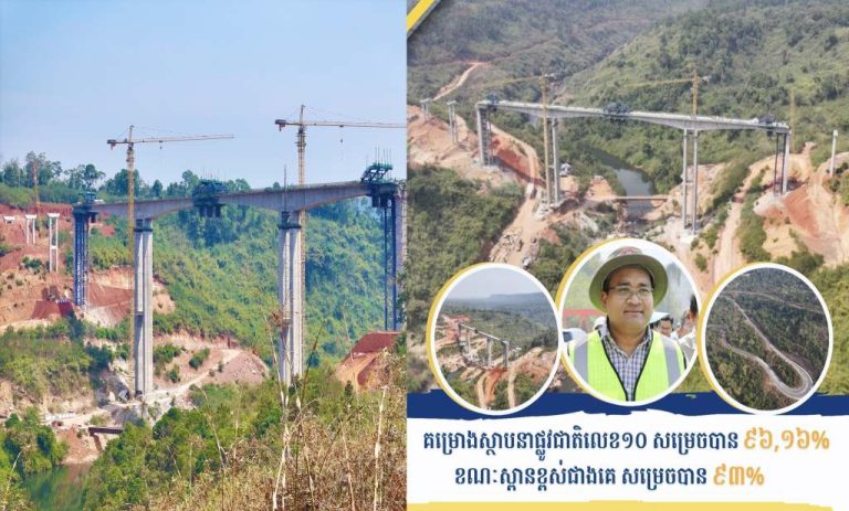 ស្ពានលេខ២៨ ដែលខ្ពស់ជាងគេ (មានកម្ពស់ ៩០ម៉ែត្រ ប្រវែង ៥៣០ម៉ែត្រ) សម្រេចបាន៩៣% ខណៈផ្លូវជាតិលេខ ១០ (អតីតផ្លូវជាតិ១៥៥១) ស្រុកសំឡូត ស្រុកវាលវែង ក្រុងខេមរភូមិន្ទ សម្រេចបាន ៩៦,១៦%។ ស្ពានលេខ២៨ ដែលខ្ពស់ជាងគេ (មានកម្ពស់ ៩០ម៉ែត្រ...