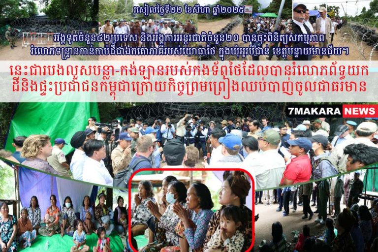 --នៅរសៀលថ្ងៃទី២២ ខែសីហា ឆ្នាំ២០២៥-- បន្ទាយមានជ័យ៖ ក្រុមតំណាងស្ថានទូតបរទេសចំនួន៤២ និងអង្គការអន្តរជាតិចំនួន២០ បានចុះទៅដល់ភូមិជោគជ័យ និងភូមិព្រៃចាន់ ឃុំអូរបីជាន់ ស្រុកអូរជ្រៅ ខេត្តបន្ទាយមានជ័យ ដើម្បីពិនិត្យមើលសកម្មភាពទន្ទ្រានកាន់កាប់ដីជាឯកតោភាគីរបស់យោធាថៃ តាមរយៈការរាយលួសបន្លា(ឡាម) រនាំងសំណាញ់ខ្មៅ និងដាក់កង់ឡានហ៊ុំព័ទ្ធយកដីនិងផ្ទះអ្នកភូមិ។ ដំណើរចុះពិនិត្យមើលសកម្មភាពជាក់ស្តែងក្រោយមានកិច្ចព្រៀមព្រៀងនិងការអនុវត្តបទឈប់បាញ់របស់ គណៈប្រតិភូបណ្តាអង្គទូតប្រចាំនៅកម្ពុជា ទីភ្នាក់ងារអង្គការសហប្រជាជាតិ (UN) និងអង្គការមិនមែនរដ្ឋាភិបាល...