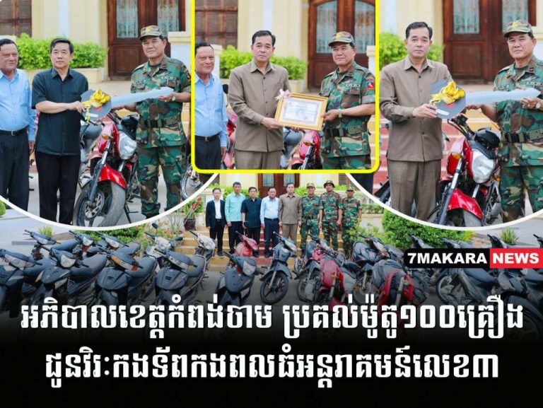យោងតាមសេចក្តីរាយការណ៍របស់រដ្ឋបាលខេត្តកំពង់ចាមតាមបណ្តាញសង្គមហ្វេសបុក(Facebook page) នាថ្ងៃទី២១ ខែសីហា ឆ្នាំ២០២៥-- ខេត្តកំពង់ចាម៖ ស្របពេលដែលសមរភូមិជួរមុខកំពុងតែឈរជើងទុបទល់និងការឈ្លានពានពីសំណាក់កងទ័ពសៀម នៅចំណុចព្រំដែនខេត្តព្រះវិហារ និងឧត្តរមានជ័យ បានជួបកង្វះខាតសម្ភារៈប្រើប្រាស់មួយចំនួន។ ដោយឃើញបែបនេះ រដ្ឋបាលខេត្តកំពង់ចាម ពិសេសក្រោមការសម្របសម្រួលពីឯកឧត្តមកើត រិទ្ធ ឧបនាយករដ្ឋមន្ត្រីរដ្ឋមន្ត្រីក្រសួងយុត្តិធម៌ បានផ្ដល់ជូនម៉ូតូច្រើនប្រភេទរហូតដល់ចំនួន ១០០គ្រឿង សម្រាប់កងកម្លាំងជួរមុខយកទៅបំពេញការងារបម្រើក្នុងអង្គភាពងាយស្រួលឈរជើងការពារតាមបន្ទាត់ព្រំដែន។ លោកឧត្តមសេនីយ៍ទោឈឺន វណ្ណីមេបញ្ជាការរងកងពលធំលេខ៣...