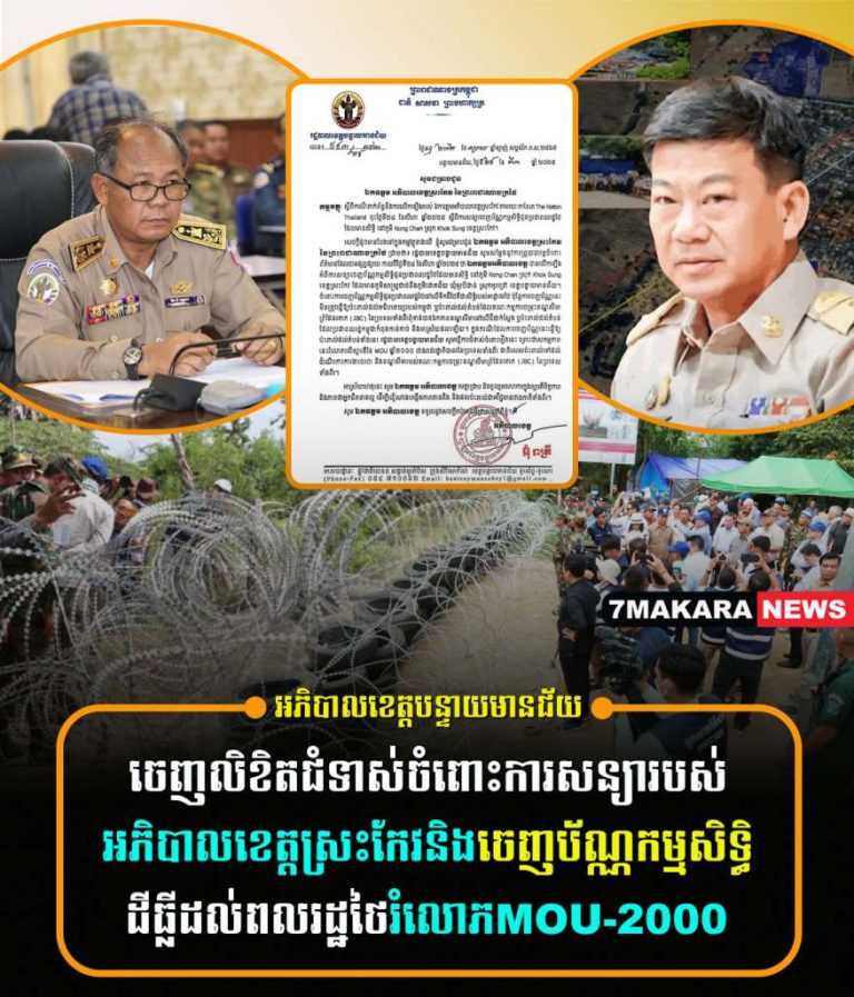 លោកជំទាវ ឧត្តមសេនីយ៍ឯក ម៉ាលី សុជាតា អ្នកនាំពាក្យក្រសួងការពារជាតិ នៃព្រះរាជាណាចក្រកម្ពុជា នៅថ្ងៃទី២៥ ខែសីហា ឆ្នាំ២០២៥ ចាប់ពីម៉ោង ១៤:២០ នាទី រសៀលនេះ កងកម្លាំងយោធារបស់ថៃបានព្យាយាមរាយបន្លាលួសនៅភូមិជោគជ័យ ឃុំអូរបីជាន់ ស្រុកអូរជ្រៅ ខេត្តបន្ទាយមានជ័យ ដែលទល់មុខភូមិសាស្ត្រភូមិ Nong Chan...