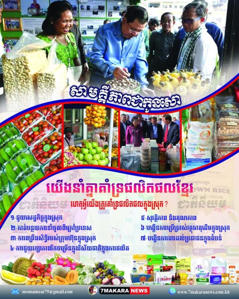 -សាមគ្គីភាពជាកូនសោ -យើងនាំគ្នាគាំទ្រផលិតផលខ្មែរ ..................................... *តើហេតុអ្វីយើងត្រូវនាំគ្នាគាំទ្រផលិតផលក្នុងស្រុក? ១-ជួយសេដ្ឋកិច្ចក្នុងស្រុក ២-កាត់បន្ថយការនាំចូលផលិតផលពីក្រៅប្រទេស ៣-ការពង្រឹងសិទ្ធិ និងសមត្ថភាពរបស់ក្រុមហ៊ុនក្នុងស្រុក ៤-ការជួយរក្សាភាពរីកចម្រើនក្នុងវិស័យជាតិក្នុងការផលិត ៥-សុវត្ថិភាព និងគុណភាព ៦-បង្កើនការប្រើប្រាស់វត្ថុធាតុដើមក្នុងស្រុក ៧-បង្កើនការងារដល់ប្រជាជនក្នុងតំបន់