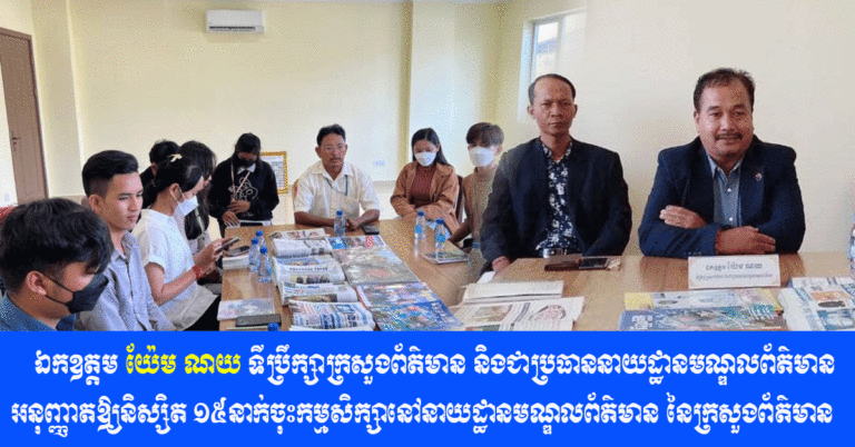 ឯកឧត្ដម យ៉ែមណយ ទីប្រឹក្សាក្រសួងព័ត៌មាន និងជាប្រធាននាយដ្ឋានមណ្ឌលព័ត៌មាន អនុញ្ញាតឱ្យនិស្សិត ១៥នាក់ចុះកម្មសិក្សានៅនាយដ្ឋានមណ្ឌលព័ត៌មាន នៃក្រសួងព័ត៌មាន ភ្នំពេញ៖ នៅព្រឹកថ្ងៃ២៤ ខែមិនា ឆ្នាំ២០២៣ ក្នុងក្រសួងព័ត៌មាន ឯកឧត្តម យ៉ែម ណយ ទីប្រឹក្សាក្រសួងព័ត៌មាន និងជាប្រធាននាយដ្ឋានមណ្ឌលព័ត៌មាន បានអនុញ្ញាតឱ្យនិស្សិតមកពីសកលវិទ្យាល័យកម្ពុជា ចំនួន ១៥...