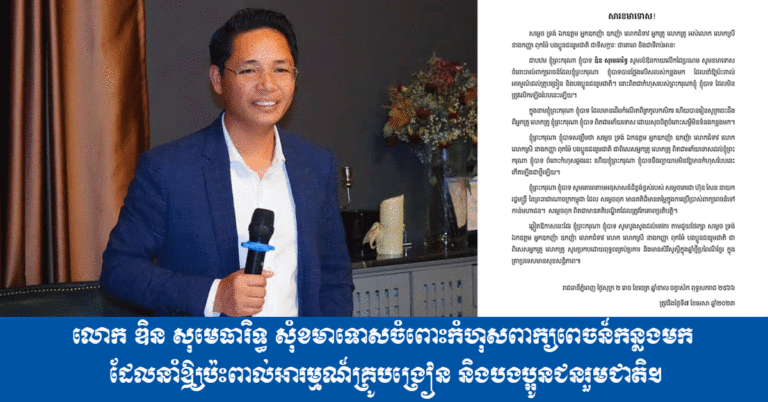 លោក ឌិន សុមេធារិទ្ធ សុំខមាទោសចំពោះកំហុសពាក្យពេចន៍កន្លងមកដែលនាំឱ្យប៉ះពាល់អារម្មណ៍គ្រូបង្រៀន និងបងប្អូនជនរួមជាតិ ភ្នំពេញថ្ងៃទី៧ ខែមេសា ឆ្នាំ២០២៣- បន្ទាប់ពីមានការរិះគន់ព្រោងព្រាតចំពោះពាក្យសម្ដីវាគ្មិន បណ្ដុះបណ្ដាល ដែលបានប្រៀបធៀបរវាងអ្នកមាន និងអ្នកក្រ លោក ឌិន សុមេធារិទ្ធ ស្ថាបនិកភូមិផ្កាត្រកួន និងជាប្រធានសមាគមសណ្ឋាគារ នៅថ្ងៃទី ៧ ខែមេសា...