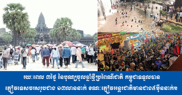 ក្រសួងទេសចរណ៍៖ រយៈពេល ៣ថ្ងៃ នៃបុណ្យចូលឆ្នាំថ្មីប្រពៃណីជាតិ កម្ពុជាទទួលបានភ្ញៀវទេសចរសរុបជាង ១៣លាននាក់ ខណៈភ្ញៀវអន្ដរជាតិមានជាង៥ម៉ឺននាក់។ ភ្នំពេញ ថ្ងៃទី១៧ ខែមេសា ឆ្នាំ២០២៣ ក្នុងរយៈពេល៣ថ្ងៃ នៃពិធីបុណ្យចូលឆ្នាំថ្មីប្រពៃណីជាតិ ចាប់ពីថ្ងៃទី១៤-១៦ ខែមេសា ឆ្នាំ២០២៣ នៅទូទាំងប្រទេសកម្ពុជាទទួលបានភ្ញៀវទេសចរសរុប ១៣ ១៨៧ ៧៧១...