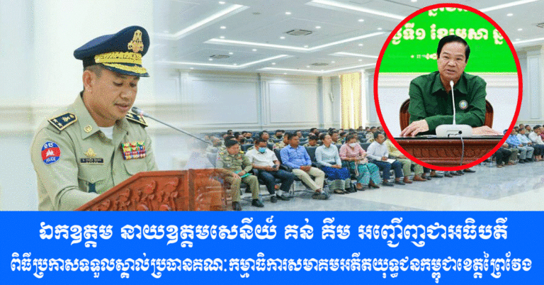 ឯកឧត្តម នាយឧត្តមសេនីយ៍ គន់ គីម អញ្ជើញជាអធិបតី ពិធីប្រកាសទទួលស្គាល់ប្រធានគណៈកម្មាធិការសមាគមអតីតយុទ្ធជនកម្ពុជាខេត្តព្រៃវែង ចេញផ្សាយ ថ្ងៃទី ០១ ខែ មេសា ឆ្នាំ ២០២៣ ព្រែវែង៖ ឯកឧត្តម នាយឧត្តមសេនីយ៍ កិត្តិសង្គហបណ្ឌិត គន់ គីម ទេសរដ្ឋមន្ត្រី...