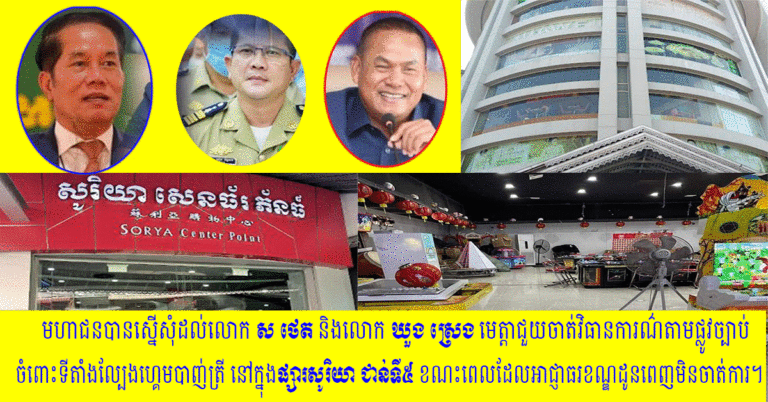 មហាជនបានស្នើសុំដល់លោក ស ថេត និងលោក ឃួង ស្រេង មេត្តាជួយចាត់វិធានការណ៌តាមផ្លូវច្បាប់ ចំពោះទីតាំងល្បែងហ្គេមបាញ់ត្រី នៅក្នុងផ្សារសូរិយា ជាន់ទី៥ ខណះពេលដែលអាជ្ញាធរខណ្ឌដូនពេញមិនចាត់ការ។ ភ្នំពេញ៖ចេញផ្សាយថ្ងៃទី០៩ ខែមីនា ឆ្នាំ២០២៣។ មហាជនដែលត្រូវជាអាណាព្យាបាលរបស់ក្មេងៗ នៅក្នុងខណ្ឌដូនពេញ រាជធានីភ្នំពេញ បានសំណូមពរដល់លោកស ថេត ស្នងការក្រុងភ្នំពេញ...