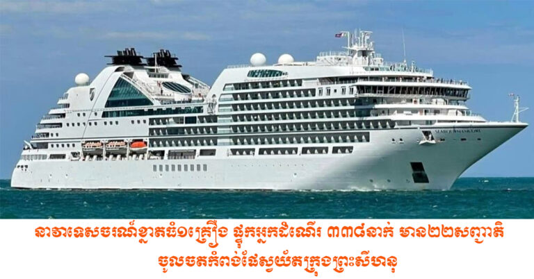 ចេញផ្សាយថ្ងៃអាទិត្យ ៨កើត ខែមាឃ ឆ្នាំខាល ចត្វាស័ក ព.ស ២៥៦៦, ត្រូវនឹងថ្ងៃទី២៩ ខែមករា ឆ្នាំ២០២៣ នាវាទេសចរណ៍ខ្នាតធំ១គ្រឿង ផ្ទុកអ្នកដំណើរ ៣៣៨នាក់ មាន២២សញ្ជាតិ ចូលចតកំពង់ផែស្វយ័តក្រុងព្រះសីហនុ។ (ព្រះសីហនុ)៖ នាវាទេសចរណ៍ខ្នាតធំ ១គ្រឿងទៀតមានឈ្មោះ SEABOURN ENCORE...