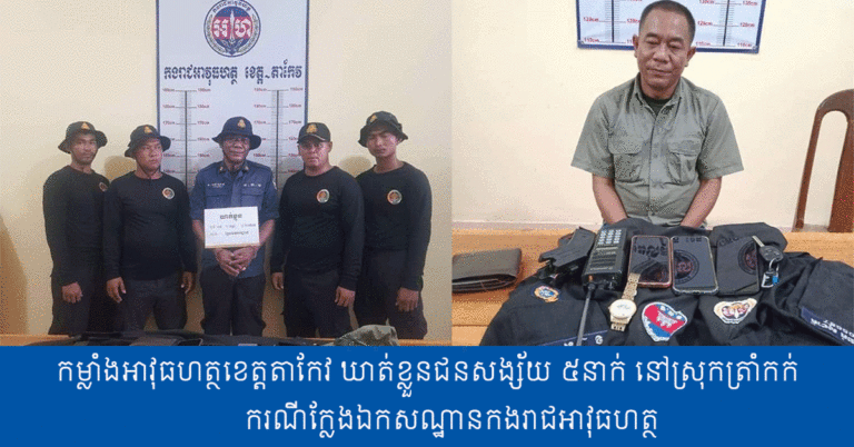 ចេញផ្សាយថ្ងៃសៅរ៍ ៦រោច ខែមាឃ ឆ្នាំខាល ចត្វាស័ក ព.ស ២៥៦៦, ត្រូវនឹងថ្ងៃទី១១ ខែកុម្ភៈ ឆ្នាំ២០២៣ កម្លាំងអាវុធហត្ថខេត្តតាកែវ ឃាត់ខ្លួនជនសង្ស័យ ៥នាក់ នៅស្រុកត្រាំកក់ ករណីក្លែងឯកសណ្ឋានកងរាជអាវុធហត្ថ តាកែវ៖ ដោយមានបទបញ្ជាពី លោកឧត្តមសេនីយ៍ត្រី សេង មហា...