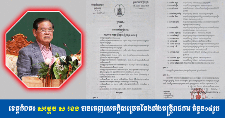 ចេញផ្សាយថ្ងៃអង្គារ៍ ២រោច ខែមាឃ ឆ្នាំខាល ចត្វាស័ក ព.ស ២៥៦៦, ត្រូវនឹងថ្ងៃទី៧ ខែកុម្ភៈ ឆ្នាំ២០២៣ ខេត្តកំពត៖ សម្ដេច ស ខេង បានចេញសេចក្ដីសម្រេចតែងតាំងមន្ដ្រីរាជការ ចំនួន១៨រូប (ភ្នំពេញ)៖ សម្ដេចក្រឡាហោម ស ខេង...