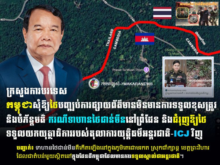 ព្រះរាជាណាចក្រកម្ពុជា ជាតិ សាសនា ព្រះមហាក្សត ក្រសួងការបរទេស និងសហប្រតិបត្តិការអន្តរជាតិ លេខ៖ ថក០៨/២០២៥ កបទ.សអ សេចក្តីថ្លែងការណ៍ របស់ក្រសួងការបរទេស និងសហប្រតិបត្តិការអន្តរជាតិ នៃព្រះរាជាណាចក្រកម្ពុជា បដិសេធការចោទប្រកាន់ថាកម្ពុជាប្រើប្រាស់មីនប្រឆាំងមនុស្ស ក្រសួងការបរទេស និងសហប្រតិបត្តិការអន្តរជាតិនៃព្រះរាជាណាចក្រកម្ពុជា ច្រានចោល ទាំងស្រុងនូវសេចក្តីថ្លែងការណ៍របស់ក្រសួងការបរទេសនៃព្រះរាជាណាចក្រថៃ កាលពីថ្ងៃទី២០ ខែកក្កដា...