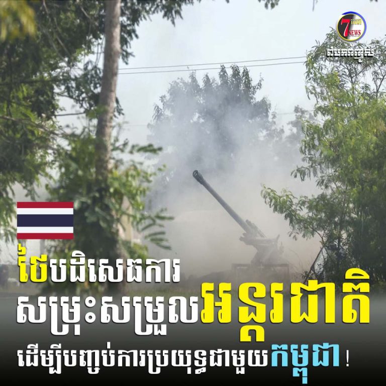 ថៃបដិសេធការសម្រុះសម្រួលអន្តរជាតិដើម្បីបញ្ចប់ការប្រយុទ្ធជាមួយកម្ពុជា។ យោងតាមការចុះផ្សាយពីសារព័ត៌មាន- reuters-25-7-2025 បាងកក៖ ក្រសួងការបរទេសថៃបាននិយាយនៅថ្ងៃសុក្រទី២៥ខែកក្កដានេះថា ប្រទេសថៃបានច្រានចោលកិច្ចខិតខំប្រឹងប្រែងសម្របសម្រួលពីប្រទេសទីបីដើម្បីបញ្ចប់ជម្លោះដែលកំពុងបន្តជាមួយកម្ពុជា ដោយទទូចឱ្យទីក្រុងភ្នំពេញបញ្ឈប់ការវាយប្រហារ និងដោះស្រាយស្ថានការណ៍តាមរយៈកិច្ចពិភាក្សាទ្វេភាគីតែប៉ុណ្ណោះ។ ភាពតានតឹងនៅតាមព្រំដែនរវាងប្រទេសថៃ និងកម្ពុជាបានផ្ទុះឡើងជាអរិភាពបើកចំហនៅទីតាំងជាច្រើននៅតាមជួរមុខ ជាមួយនឹងការផ្លាស់ប្តូរកាំភ្លើងធំក្នុងរយៈពេលពីរថ្ងៃជាប់គ្នា។