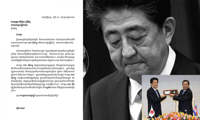 ចេញផ្សាយថ្ងៃសៅរ៍ ១១កើត ខែអាសាឍ ឆ្នាំខាល ចត្វាស័ក ព.ស ២៥៦៦, ត្រូវនឹងថ្ងៃទី៩ ខែកក្កដា ឆ្នាំ ២០២២ សម្តេចអគ្គមហាសេនាបតីតេជោ ហ៊ុន សែន នាយករដ្ឋមន្ត្រីនៃព្រះរាជាណាចក្រកម្ពុជា បានចេញលិខិតចូលរួមរំលែកទុក្ខដ៏ក្រៀមក្រំបំផុត និងសមានចិត្តដ៏ជ្រាលជ្រៅចំពោះឯកឧត្តម អាបេ ស៊ីនហ្សូ និងក្រុមគ្រួសារនៃសព...