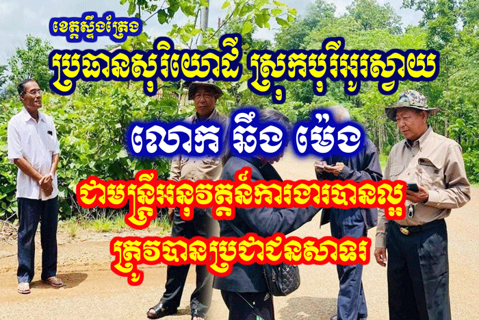 ចេញផ្សាយថ្ងៃចន្ទ ៨រោច ខែពិសាខ ឆ្នាំខាល ចត្វាស័ក ព.ស ២៥៦៦, ត្រូវនឹងថ្ងៃទី២៣ ខែឧសភា ឆ្នាំ ២០២២ លោក ឆឹង ម៉េង ប្រធានសុរិយោដី ស្រុកបុរីអូរស្វាយ ជាមន្រ្តីអនុវត្តន៍ការងារបានល្អ ត្រូវបានសាទរពីប្រជាជន ខេត្តស្ទឹងត្រែង៖ តាមការអះអាង...