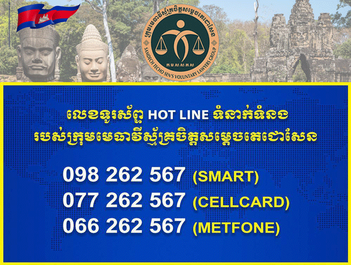 ក្រុមមេធាវីស្ម័គ្រចិត្តសម្ដេចតេជោសែន បង្ហាញបញ្ជីឈ្មោះ និងលេខទូរស័ព្ទផ្លូវការ ដើម្បីងាយស្រួលដល់ប្រជាពលរដ្ឋធ្វើការទំនាក់ទំនងផ្ទាល់ ទំនាក់ទំនងការផ្សាយ៖ 077 949441 - 096 9949441 - 071 223 1111