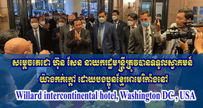 ចេញផ្សាយថ្ងៃពុធ ១១កើត ខែពិសាខ ឆ្នាំខាល ចត្វាស័ក ព.ស ២៥៦៦, ត្រូវនឹងថ្ងៃទី១១ ខែឧសភា ឆ្នាំ ២០២២ សម្តេចតេជោនាយករដ្ឋមន្រ្តីត្រូវបានទទួលស្វាគមន៍យ៉ាងកក់ក្តៅដោយបងប្អូនខ្មែរអាមេរិកាំងនៅ Willard intercontinental hotel, Washington DC , USA ...