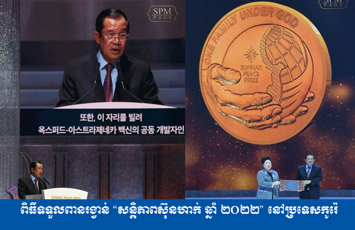ចេញផ្សាយថ្ងៃអាទិត្យ ១២កើត ខែមាឃ ឆ្នាំឆ្លូវ ត្រីស័ក ព.ស ២៥៦៥, ត្រូវនឹងថ្ងៃទី ១៣ ខែកុម្ភៈ ឆ្នាំ២០២២។ សម្តេចតេជោ ហ៊ុន សែន អញ្ជើញថ្លែងសុន្ទរកថាក្នុងពិធីទទួលពានរង្វាន់ «សន្តិភាពស៊ុនហាក់ ឆ្នាំ ២០២២» នៅប្រទេសកូរ៉េ នៅព្រឹកថ្ងៃសៅរ៍...