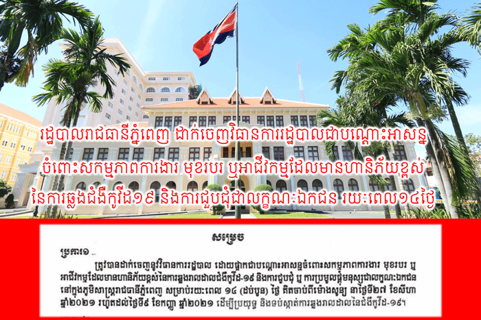 កណ្តាល៖ ចេញផ្សាយថ្ងៃពុធ ២រោច ខែស្រាពណ៍ ឆ្នាំឆ្លូវ ត្រីស័ក ព.ស ២៥៦៥, ត្រូវនឹងថ្ងៃទី ២៥ ខែ សីហា ឆ្នាំ២០២១។ រដ្ឋបាលរាជធានីភ្នំពេញ ដាក់ចេញវិធានការរដ្ឋបាលជាបណ្តោះអាសន្ន ចំពោះសកម្មភាពការងារ មុខរបរ ឬអាជីវកម្មដែលមានហានិភ័យខ្ពស់ នៃការឆ្លងជំងឺកូវីដ១៩ និងការជួបជុំជាលក្ខណៈឯកជន...