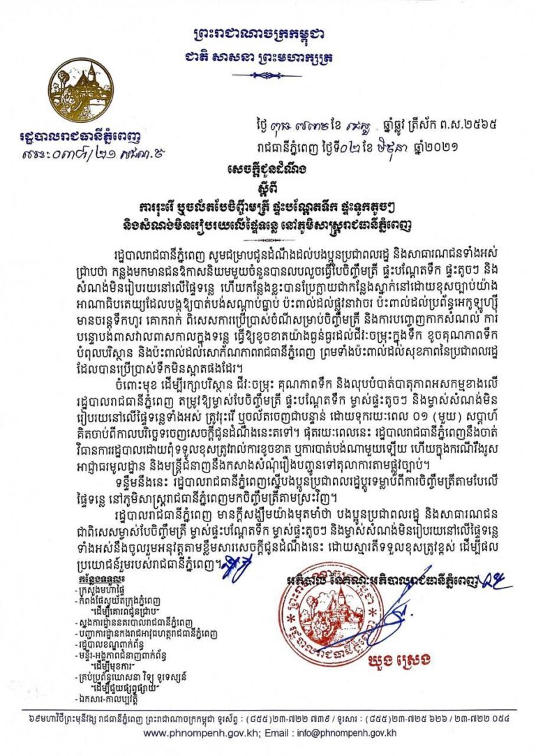 ភ្នំពេញ៖ ចេញផ្សាយ ថ្ងៃព្រហស្បតិ៍ ៨រោច ខែជេស្ឋ ឆ្នាំឆ្លូវ ត្រីស័ក ព.ស ២៥៦៥, ត្រូវនឹងថ្ងៃទី ៣ ខែ មិថុនា ឆ្នាំ២០២១។ សេចក្ដីជូនដំណឹង ស្ដីពីការរុះរើ ឬចល័តបែចិញ្ចឹមត្រី ផ្ទះបណ្ដែតទឹក ផ្ទះទូកតូចៗ និងសំណង់មិនរៀបរយលើផ្ទៃទន្លេ...