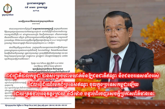 ភ្នំពេញ៖ ចេញផ្សាយ ថ្ងៃអង្គារ៍ ១រោច ខែពិសាខ ឆ្នាំឆ្លូវ ត្រីស័ក ព.ស ២៥៦៥, ត្រូវនឹងថ្ងៃទី ២៧ ខែ មេសា ឆ្នាំ២០២១។ រាជរដ្ឋាភិបាលកម្ពុជា បានសម្រេចហាមឃាត់មិនឱ្យជនជាតិឥណ្ឌា និងជនបរទេសទាំងអស់ ដែលធ្វើដំណើរមកពីប្រទេសឥណ្ឌា ចូលក្នុងប្រទេសកម្ពុជាឡើយ ដោយត្រូវចាប់អនុវត្តក្រោយ...