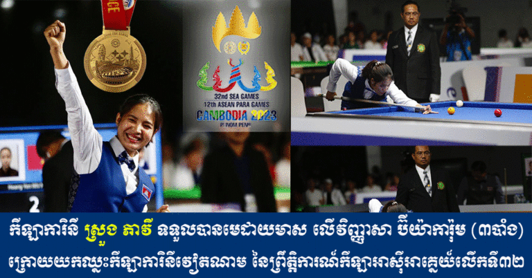 សកម្មភាព កីឡាការិនី ស្រួង ភាវី ទទួលបានមេដាយមាស លើវិញ្ញាសា ប៊ីយ៉ាការ៉ុម (៣បាំង) ក្រោយយកឈ្នះកីឡាការិនីវៀតណាម នៃព្រឹត្តិការណ៍កីឡាអាស៊ីអាគ្នេយ៍លើកទី៣២ នៅល្ងាចថ្ងៃទី០៨ ខែឧសភា ឆ្នាំ២០២៣នេះ នៅអ៊ីអនម៉ល សែនសុខ។