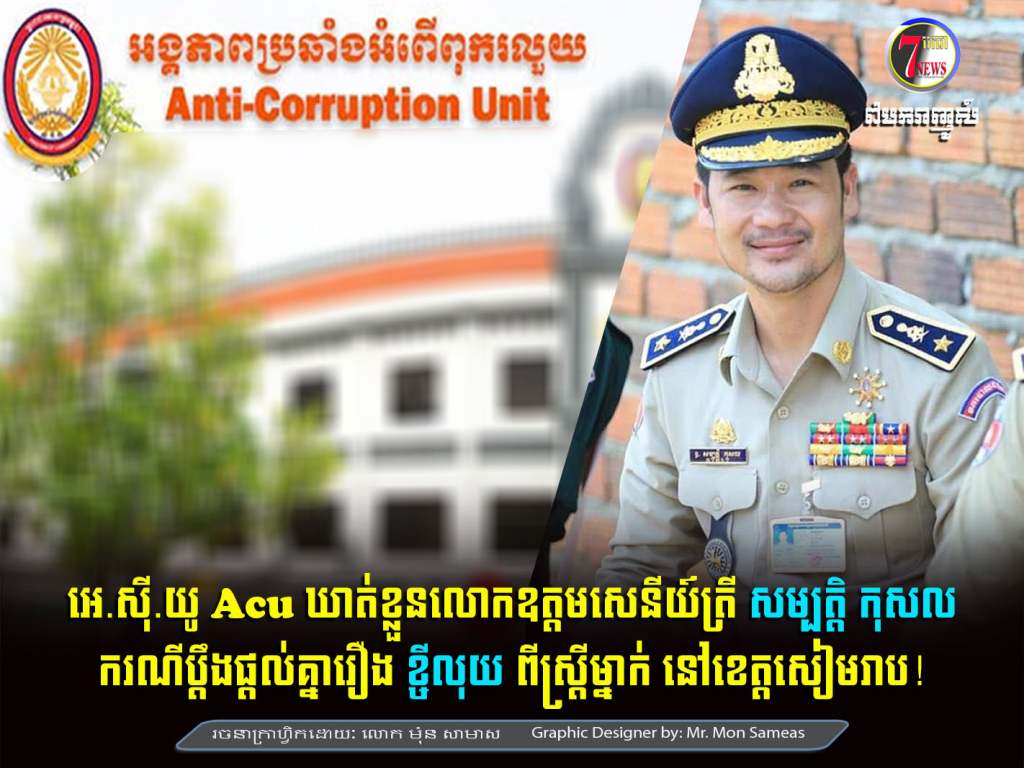 ភ្នំពេញ៖ អង្គភាពប្រឆាំងអំពើពុករលួយ (ACU) បានឃាត់ខ្លួនលោកឧត្តមសេនីយ៍ត្រី សម្បត្តិ កុសល ដែលមានរឿងក្តីជាមួយស្រ្តីម្ចាស់លុយម្នាក់នៅខេត្តសៀមរាប។