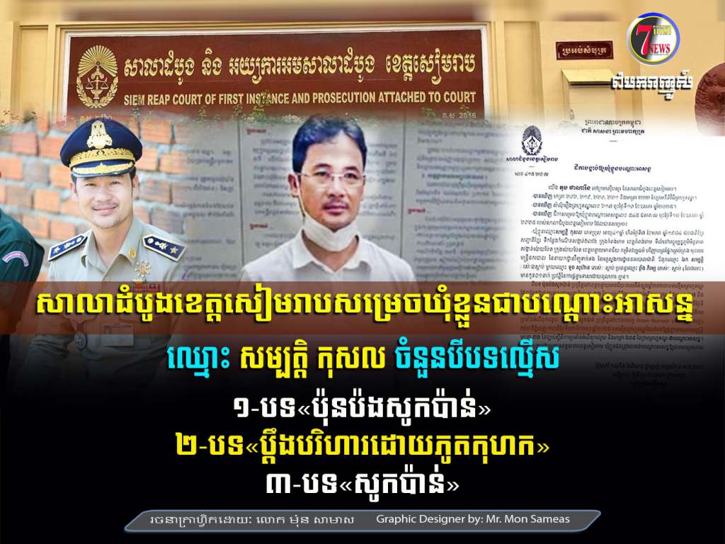 សាលាដំបូងខេត្តសៀមរាបសម្រេចឃុំខ្លួន ឈ្មោះ សម្បត្តិ កុសល នៃក្រមព្រហ្មទណ្ឌ ជាបណ្តោះអាសន្ន ១-បទ«ប៉ុនប៉ងសូកប៉ាន់» ២-បទ«ប្តឹងបរិហារដោយភូតកុហក» ៣-បទ«សូកប៉ាន់»