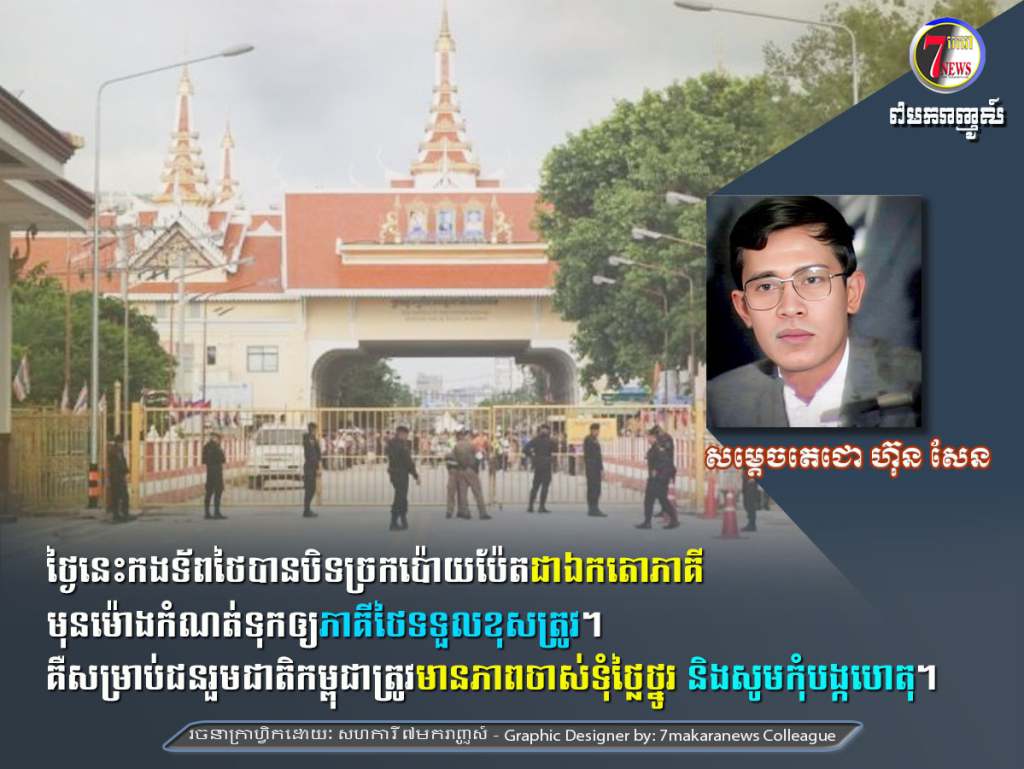 ថ្ងៃនេះកងទ័ពថៃបានបិទច្រកប៉ោយប៉ែតជាឯកតោភាគីមុនម៉ោងកំណត់ គឺទុកឲ្យភាគីថៃទទួលខុសត្រូវ។ សម្រាប់ជនរួមជាតិកម្ពុជាត្រូវមានភាពចាស់ទុំថ្លៃថ្នូរ និងសូមកុំបង្កហេតុ។