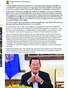 កាលពីល្ងាចថ្ងៃទី១៥ ខែមិថុនា ឆ្នាំ២០២៥ ខ្ញុំពិតជាបានសន្ទនាតាមទូរស័ព្ទជាមួយនាយករដ្ឋមន្រ្តីថៃ រយៈពេល១៧៖០៦នាទី ដោយមានលោក ឃ្លាំង ហួត ជាអ្នកបកប្រែ ហើយជាទម្លាប់ដើម្បីកិច្ចការទាំងឡាយមិនបានគេបំភាន់ ឬបន្លំ ចាំបាច់ត្រូវការថតសម្លេង និងដើម្បីតម្លាភាពជាមួយផ្ទៃក្នុងរបស់កម្ពុជាផងដែរ។