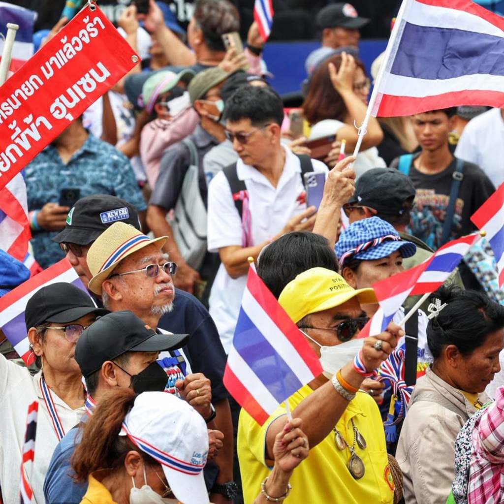 នៅក្រុងបាងកកជុំវិញវិមានឈ្នះឈ្នះមានក្រុមបាតុកររាប់រយនាក់បានប្រមូលផ្តុំគ្នា កាលពីថ្ងៃសៅរ៍ដើម្បីទាមទារឱ្យលោកស្រីនាយករដ្ឋមន្ត្រី ផេថងថាន/Paetongtarn Shinawatra ចុះចេញពីតំណែង ដែលជាផ្នែកមួយនៃភាពចលាចលនយោបាយថៃដែលកើតឡើងដោយការបែកធ្លាយសំឡេងសន្ទនាតាមទូរស័ព្ទជាមួយសម្តេចតេជោ ហ៊ុន សែន អតីតនាយករដ្ឋមន្ត្រីកម្ពុជា។