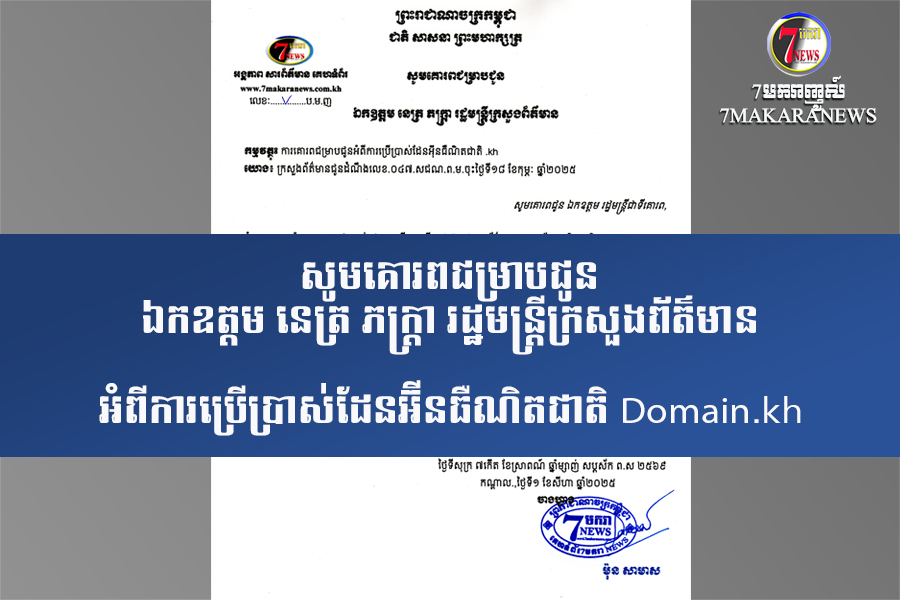 ខ្ញុំបាទឈ្មោះ ម៉ុន សាមាស ជាម្ចាស់អង្គភាពបើកបម្រើសេវាផ្សព្វផ្សាយព័ត៌មានតាមប្រព័ន្ធអេឡិចត្រូនិក សូមគោរពជម្រាបជូន ឯកឧត្តមរដ្ឋមន្ត្រីក្រសួងព័ត៌មាន ថា៖ អង្គភាពសារព័ត៌មាន គេហទំព័រព័ត៌មាន របស់ខ្ញុំបាទ បានដាក់ពាក្យចុះឈ្មោះសូមប្រើប្រាស់អ៊ីនធឺណិតដែនជាតិ .kh តាមនីតិវិធី និង ស្របតាមការជូនដំណឹងពីក្រសួងព័ត៌មាន រួចរាល់ជាស្ថាពរ នៅនិយ័តករទូរគមនាគមន៍កម្ពុជា លេខៈ .៦៤៧៨.ន.ទ.ក ចុះថ្ងៃទី២៥ ខែកក្កដា ឆ្នាំ២០២៥ ។