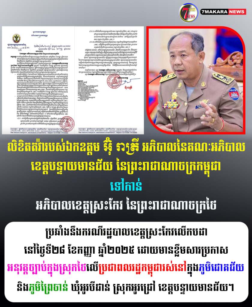 សេចក្ដីដូចមានចែងក្នុងកម្មវត្ថុខាងលើ ខ្ញុំសូមគោរពជម្រាបជូន ឯកឧត្តមអភិបាលខេត្ត ស្រះកែវ នៃព្រះរាជាណាចក្រថៃ ជ្រាបថា៖ កាលពីថ្ងៃទី២៨ ខែកញ្ញា ឆ្នាំ២០២៥ រដ្ឋបាលខេត្ត ស្រះកែវ បានលើកបដាដោយមានខ្លឹមសារ ស្តីពីការអនុវត្តច្បាប់ក្នុងស្រុកថៃលើប្រជាពលរដ្ឋកម្ពុជារស់នៅ ក្នុងភូមិជោគជ័យ និងភូមិព្រៃចាន់ ឃុំអូរបីជាន់ ស្រុកអូរជ្រៅ ខេត្តបន្ទាយមានជ័យ។ ក្នុងនាមរដ្ឋបាលខេត្ត បន្ទាយមានជ័យ ខ្ញុំសូមតវ៉ាប្រឆាំងដាច់អហំការចំពោះសកម្មភាពនេះដូចខាងក្រោម៖