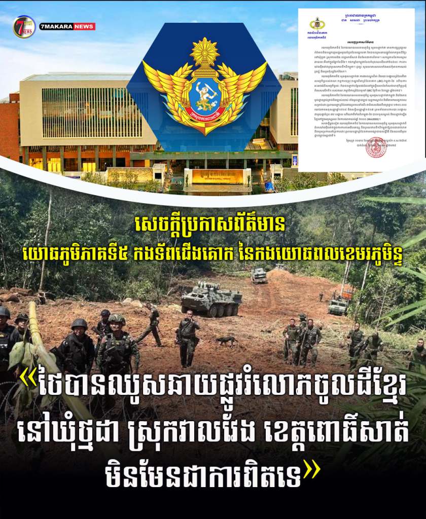 យោធភូមិភាគទី៥ កងទ័ពជើងគោក នៃកងយោធពលខេមរភូមិន្ទ យោធភូមិភាគទី៥ នៃកងយោធពលខេមរភូមិន្ទសូមចេញសេចក្តីប្រកាសព័ត៌មាន បានបញ្ជាក់ថា ការផ្សព្វផ្សាយព័ត៌មាននិងបណ្តាញសង្គមមួយចំនួនដែលផ្សាយថា ថៃបានឈូសឆាយផ្លូវរំលោភចូលដីខ្មែរ នៅឃុំថ្មដា ស្រុកវាលវែង ខេត្តពោធិ៍សាត់ មិនមែនជាការពិតទេ ដោយសកម្មភាពនៃការឈូសឆាយនេះគឺស្ថិតនៅក្នុងផ្នែកនៃដីថៃ។