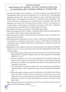 ៧. ភាគីទាំងពីរបានឯកភាពថា កិច្ចប្រជុំបន្ទាប់របស់គណៈកម្មការចម្រុះខណ្ឌសីមាព្រំដែនគោក (JBC) នឹង ប្រព្រឹត្តទៅនៅសប្ដាហ៍ទីមួយនៃខែមករា ឆ្នាំ ២០២៦ នៅខេត្តសៀមរាប ព្រះរាជាណាចក្រកម្ពុជា។