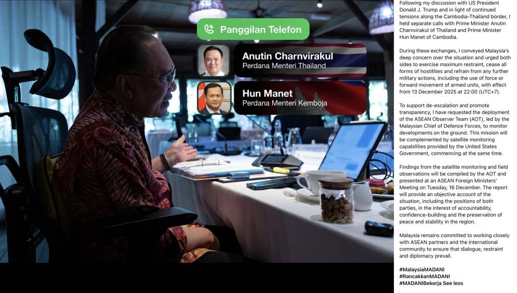 ប្រធានអាស៊ាន លោក អាន់វ៉ា អ៊ីប្រាហ៊ីម ស្នើឲ្យភាគីទាំងពីរ កម្ពុជា-ថៃ ឈប់បាញ់គ្នាចាប់ពីម៉ោង១០យប់ថ្ងៃទី១៣ ខែធ្នូ ឆ្នាំ២០២៥ ហើយស្នើឲ្យក្រុមAOT ប្រើរូបភាពផ្កាយរណបនិងការប្រមូលភស្តុតាងដាក់ជូនកិច្ចប្រជុំរដ្ឋមន្ត្រីការបរទេសអាស៊ាននៅថ្ងៃទី១៦ ខែធ្នូ ឆ្នាំ២០២៥។