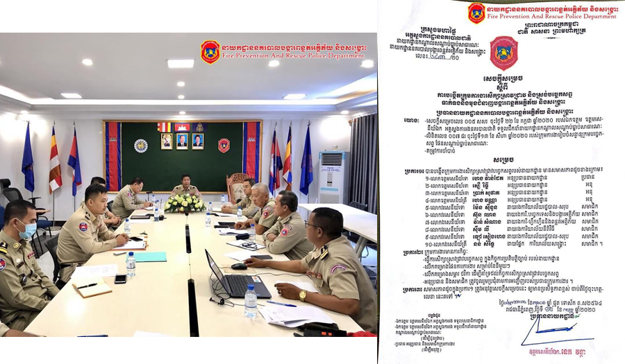ភ្នំពេញ៖ រាជធានីភ្នំពេញ៖ ថ្ងៃអង្គារ ៥ កើត ខែអស្សុជ ឆ្នាំជូត ទោស័ក ពស ២៥៦៤ ត្រូវនឹងថ្ងៃទី២២ ខែកញ្ញា ឆ្នាំ២០២០ វេលាម៉ោង ០៨:៣០ នាទីព្រឹក ថ្នាក់ដឹកនាំនិងក្រុមការងារជំនាញរបស់នាយកដ្ឋាននគរបាលបង្ការពន្លត់អគ្គិភ័យ និងសង្គ្រោះ បានបេីកកិច្ចប្រជុំស្តីពីការបង្កើតក្រុមសិក្សាស្រាវជ្រាវ និងស្រង់បច្ចេកសព្ទ ទាក់ទងនិងមុខជំនាញបង្ការពន្លត់អគ្គិភ័យ និងសង្គ្រោះ នៅសាលប្រជុំរបស់នាយកដ្ឋាន នៃក្រសួងមហាផ្ទៃ ។