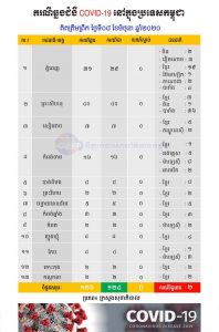 តារាងស្ថិតិនៃជំងឺកូវីដ-១៩ (Covid-១៩) នៅក្នុងព្រះរាជាណាចក្រកម្ពុជា គិតត្រឹមព្រឹកទី៨ ខែមិថុនា ឆ្នាំ២០២០
