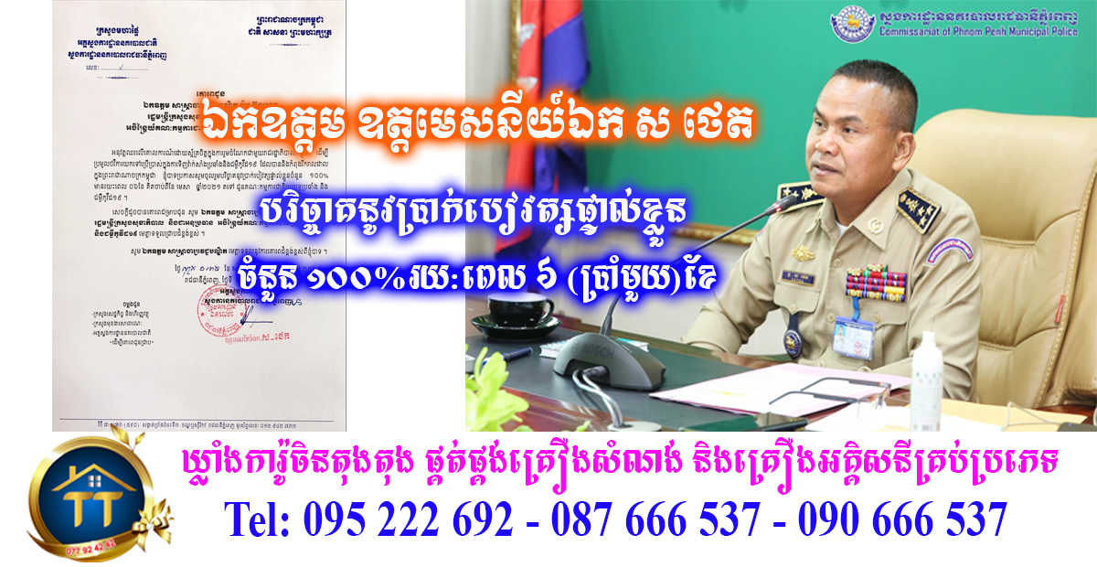 ឯកឧត្តម ឧត្តមសេនីយ៍ឯក ស ថេត អគ្គស្នងការរង និងជាស្នងការនគរបាលរាជធានីភ្នំពេញ សូមចូលរួមបរិច្ចាគនូវប្រាក់បៀវត្សផ្ទាល់ខ្លួនចំនួន ១០០% មានរយ:ពេល ០៦ខែ គិតចាប់ពីខែមេសា ដល់ខែ កញ្ញា ឆ្នាំ២០២១ ជូនដល់គណ:កម្មការជាតិប្រយុទ្ធប្រឆាំង និងជម្ងឺកូវីដ១៩ ៕