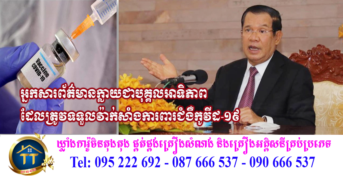 សម្តេចអគ្គមហាសេនាបតីតេជោ ហ៊ុន សែន នាយករដ្ឋមន្រ្តីនៃព្រះរាជាណាចក្រកម្ពុជា បាន អនុញ្ញាតឱ្យអ្នកសារព័ត៌មានក្លាយជាបុគ្គលអាទិភាព ដែលត្រូវ ទទួលវ៉ាក់សាំងការពារជំងឺកូវីដ-១៩ ព្រោះអ្នកសារព័ត៌មានជាជនដែលចល័តគ្រប់ទីកន្លែងដើម្បី ប្រមាញ់ព័ត៌មានជូនសាធារណជនជ្រាប ។