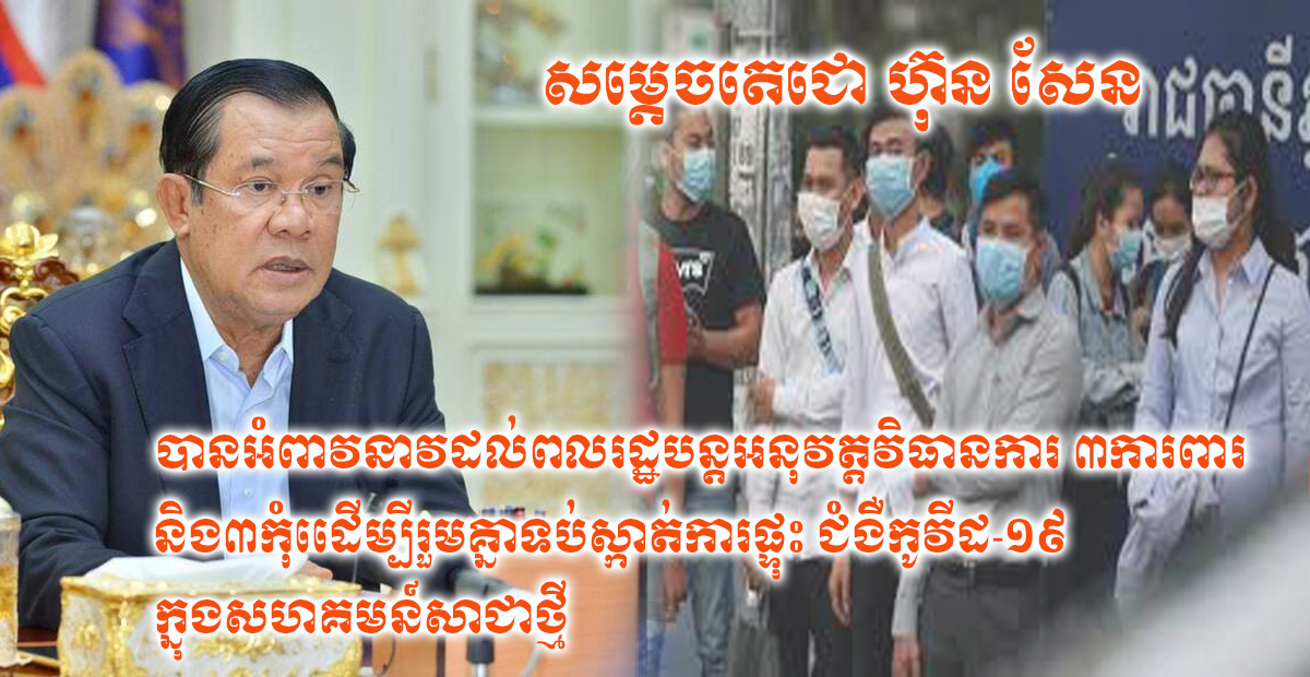 សម្តេចតេជោហ៊ុនសែននាយករដ្ឋមន្រ្តីនៃព្រះរាជាណាចក្រកម្ពុជា បានអំពាវនាវដល់ពលរដ្ឋបន្តអនុវត្តវិធានការ ៣ការពារ និង៣កុំដើម្បីរួមគ្នាទប់ស្កាត់ការផ្ទុះ ជំងឺកូវីដ-១៩ ក្នុងសហគមន៍សាជាថ្មី