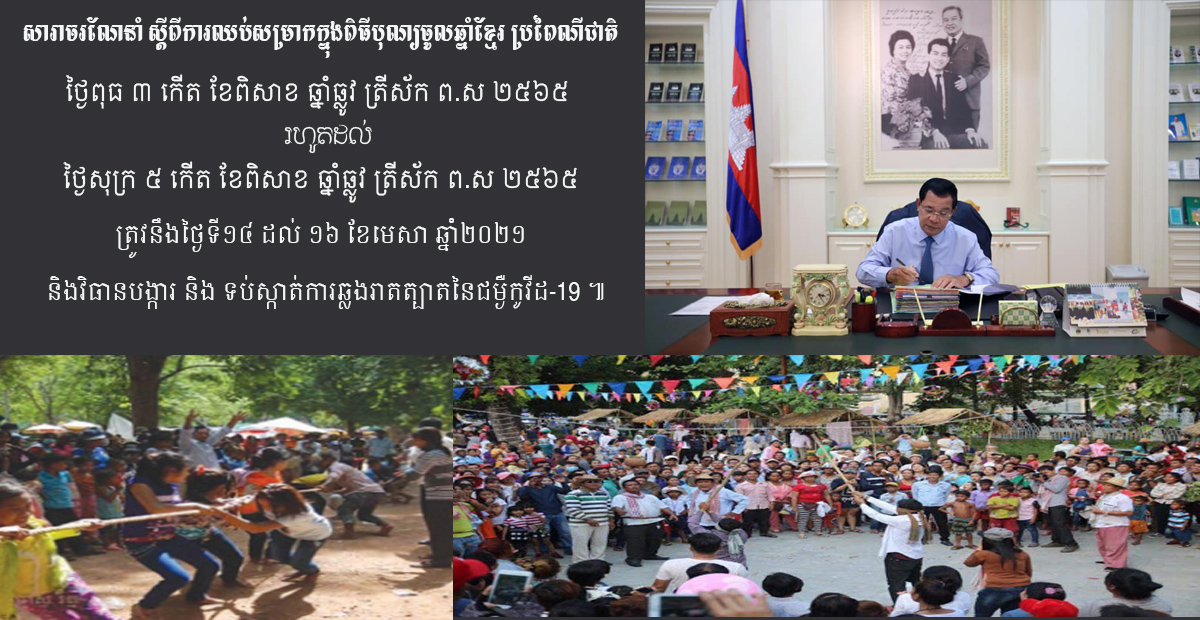 សារាចរណែនាំ ស្ដីពីការឈប់សម្រាកក្នុងពិធីបុណ្យចូលឆ្នាំខ្មែរ ប្រពៃណីជាតិ ពី ថ្ងៃពុធ ៣ កើត ខែពិសាខ ឆ្នាំឆ្លូវ ត្រីស័ក ព.ស ២៥៦៥ ដល់ថ្ងៃសុក្រ ៥ កើត ខែពិសាខ ឆ្នាំឆ្លូវ ត្រីស័ក ព.ស ២៥៦៥ ត្រូវនឹងថ្ងៃទី១៤ ដល់ ១៦ ខែមេសា ឆ្នាំ២០២១ និងវិធានបង្ការ និង ទប់ស្កាត់ការឆ្លងរាតត្បាតនៃជម្ងឺកូវីដ-19 ៕