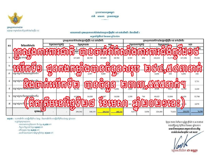 ក្រសួងការពារជាតិ បានចាក់វ៉ាក់សាំងការពារជំងឺកូវីដ១៩ លើកទី១ ជូនកងកម្លាំងបានចំនួនសរុប ២៩៤,៥៤៣នាក់ និងចាក់លើកទី២ បានចំនួន ២៣៣,៥៥៥នាក់។