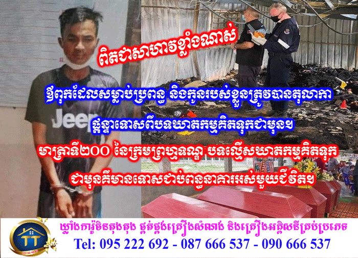 ជនល្មើសត្រូវបានកម្លាំងសមត្ថកិច្ចឃាត់ខ្លួននៅយប់កើត ហេតុ ហើយបានផ្តល់សេចក្តីបំភ្លឺមួយចំនួនទៅកម្លាំងសមត្ថ កិច្ចរៀបរាប់អំពីការផ្តើមនូវអគ្គីភ័យនេះ។ ក្នុងពេលនោះក្រុម ការងារជំនាញក៏បានចាប់ផ្តើមធ្វើកោសល្យវិច័យទៅលើសាកសព និងកន្លែងកើតហេតុទាំងស្រុង។ ពេលដែលក្រុមការងារបានរៀបរាប់ និងសួរអំពីភស្តុតាងវិទ្យាសាស្រ្តមួយចំនួនទៅកាន់ជនល្មើស គេក៏ចាប់ផ្តើមសារភាពពីអំពើឃាតកម្ម និងអគ្គីភ័យ។