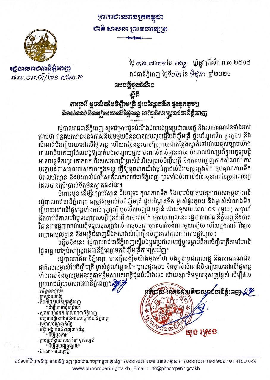 សេចក្ដីជូនដំណឹង ស្ដីពីការរុះរើ ឬចល័តបែចិញ្ចឹមត្រី ផ្ទះបណ្ដែតទឹក ផ្ទះទូកតូចៗ និងសំណង់មិនរៀបរយលើផ្ទៃទន្លេ នៅភូមិសាស្ត្ររាជធានីភ្នំពេញ ដោយទុករយៈពេល ០១សប្ដាហ៍ គិតចាប់ពីកាលបរិច្ឆេទចេញសេចក្ដីជូនដំណឹងនេះតទៅ។